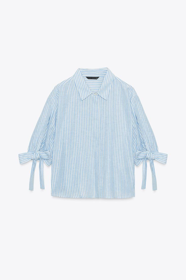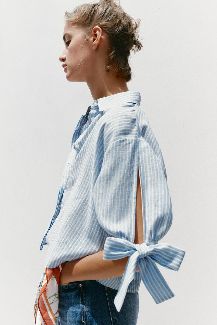 Shirt made of a linen blend with metallic thread. Featuring a lapel collar, short sleeves with bows and a front fastening with hidden buttons behind a placket.