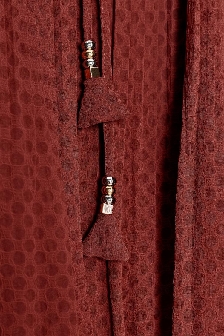 Round neck blouse with a drawstring and tassel detail. Long sleeves finished with cuffs. Elasticated trims.