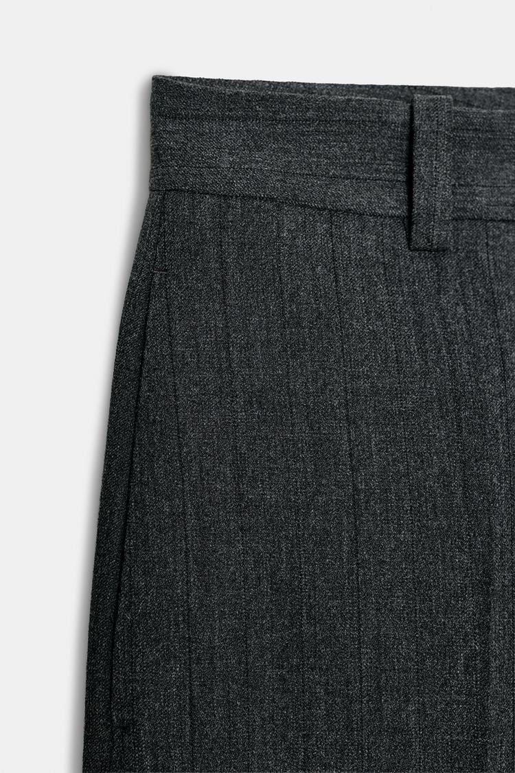 Trousers made from a yarn with 10% wool. Mid-rise and waistband with belt loops. Side pockets hidden in the seam and a flap pocket at the back. Pressed pleat detail on the front and textured fabric. Front zip, button and metal hook fastening.