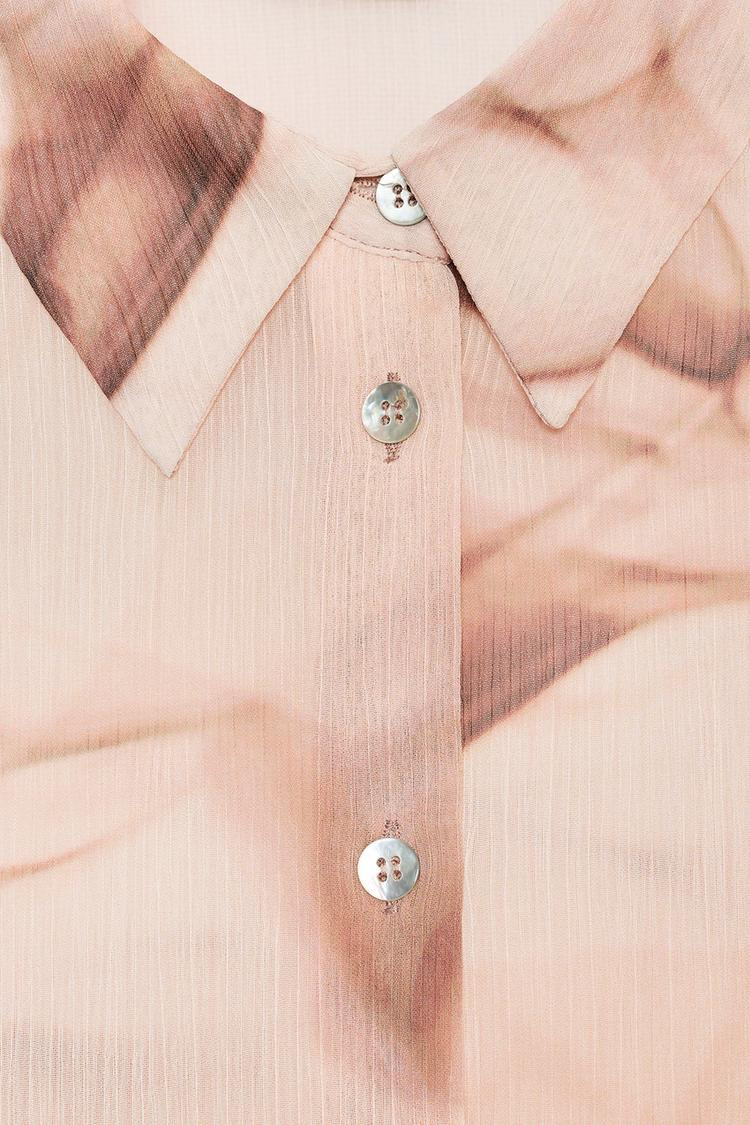 Flowing blouse with a shirt collar and long sleeves. Button-up front.