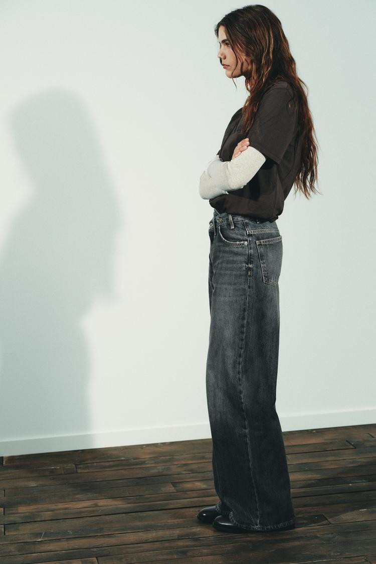 High-waist, five-pocket jeans. Extra-long wide leg. Asymmetric front fastening with zip and metal buttons..