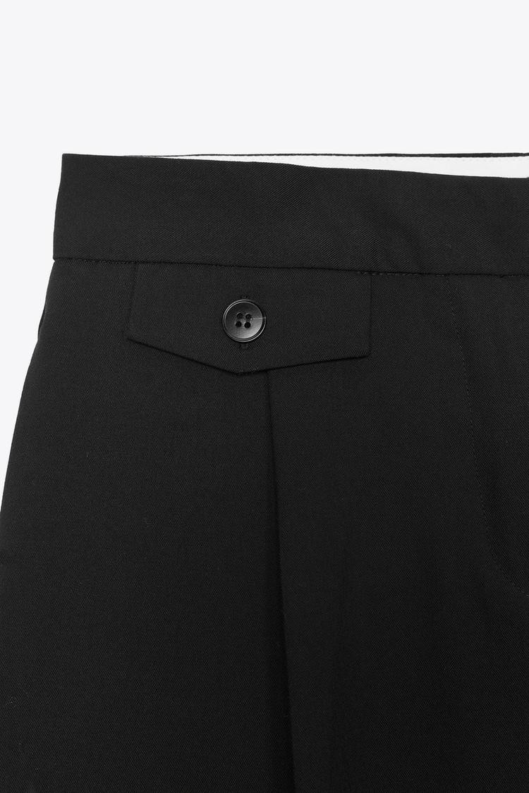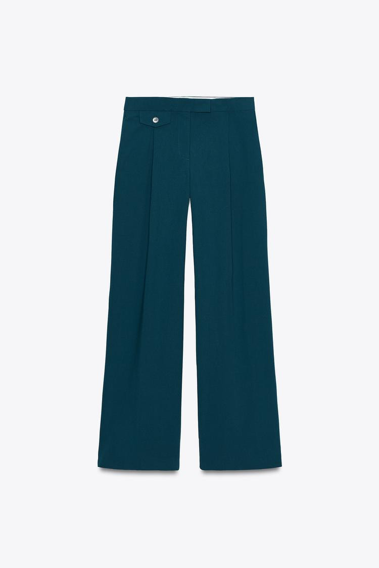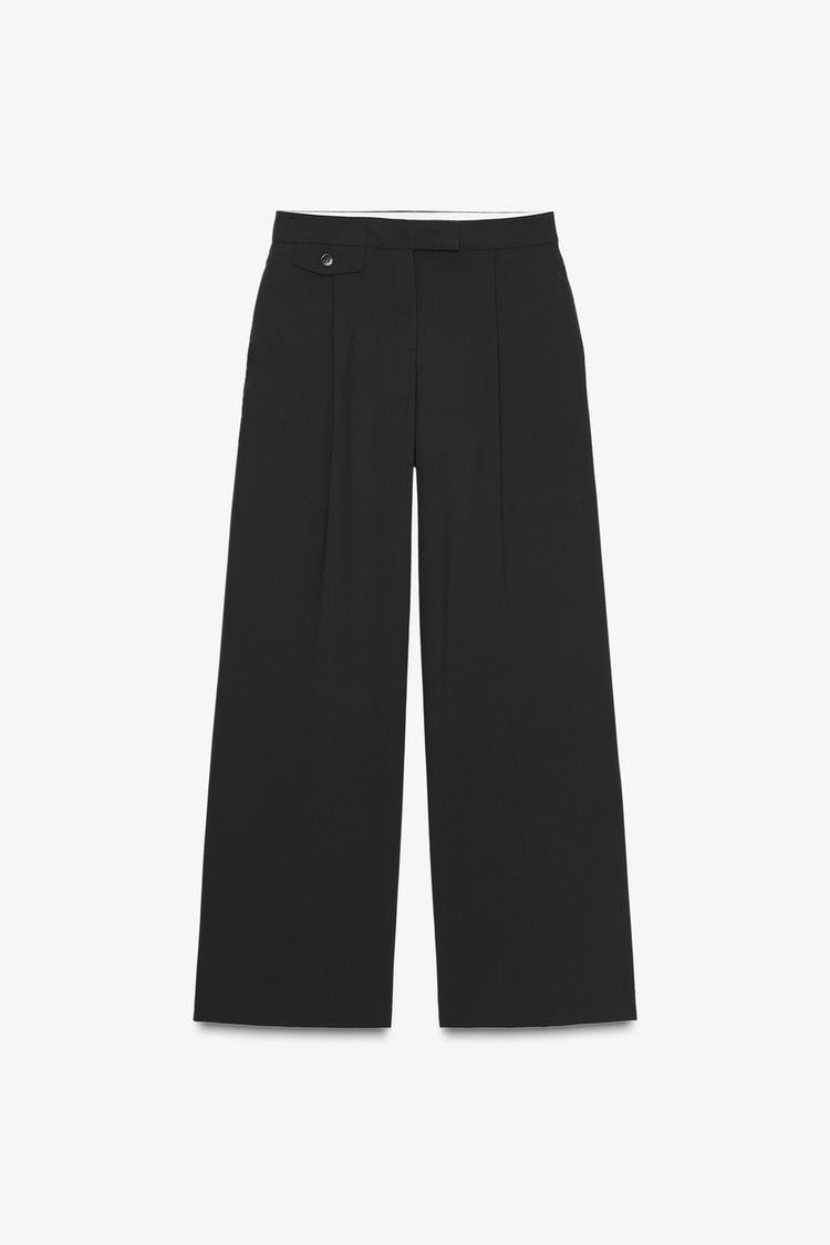 High-waist trousers with darts and front pockets. Featuring flap detail on the front and back. Wide leg. Front fastening with zip, inside button and hook.