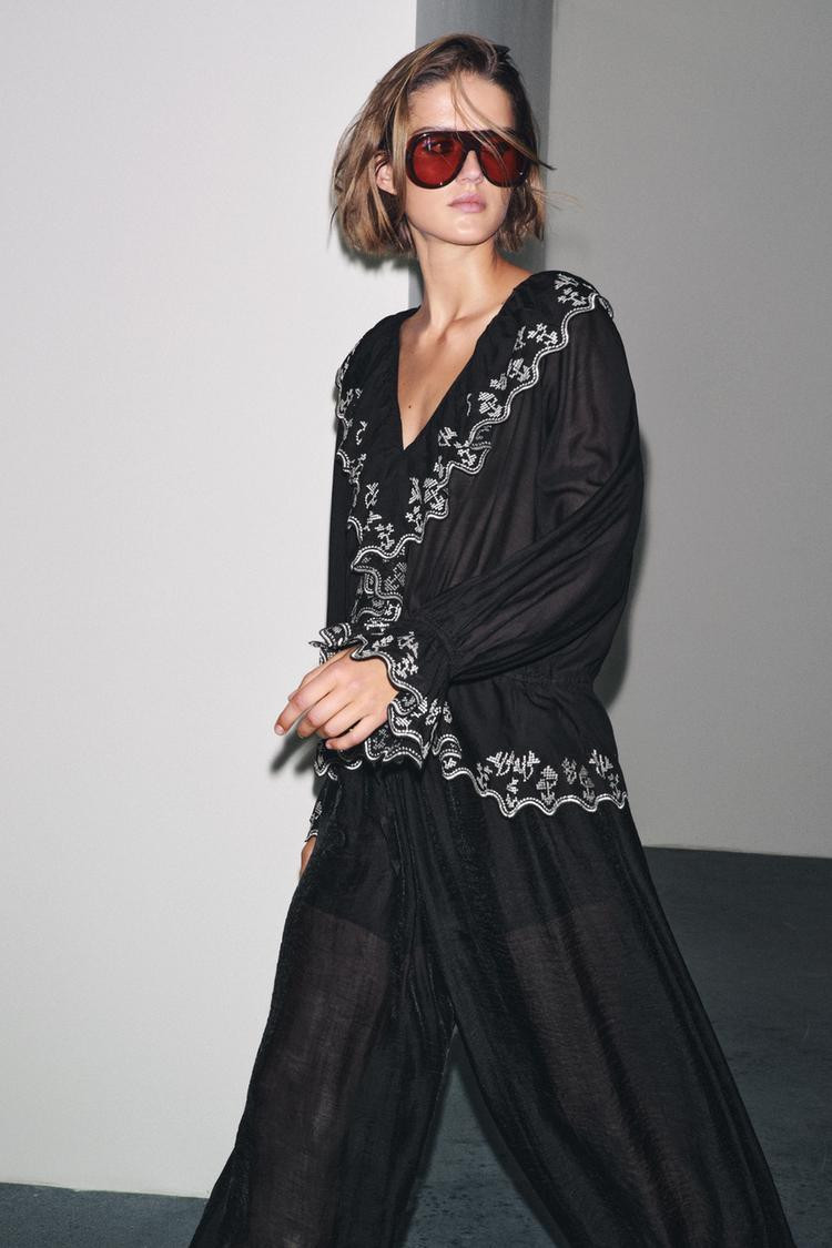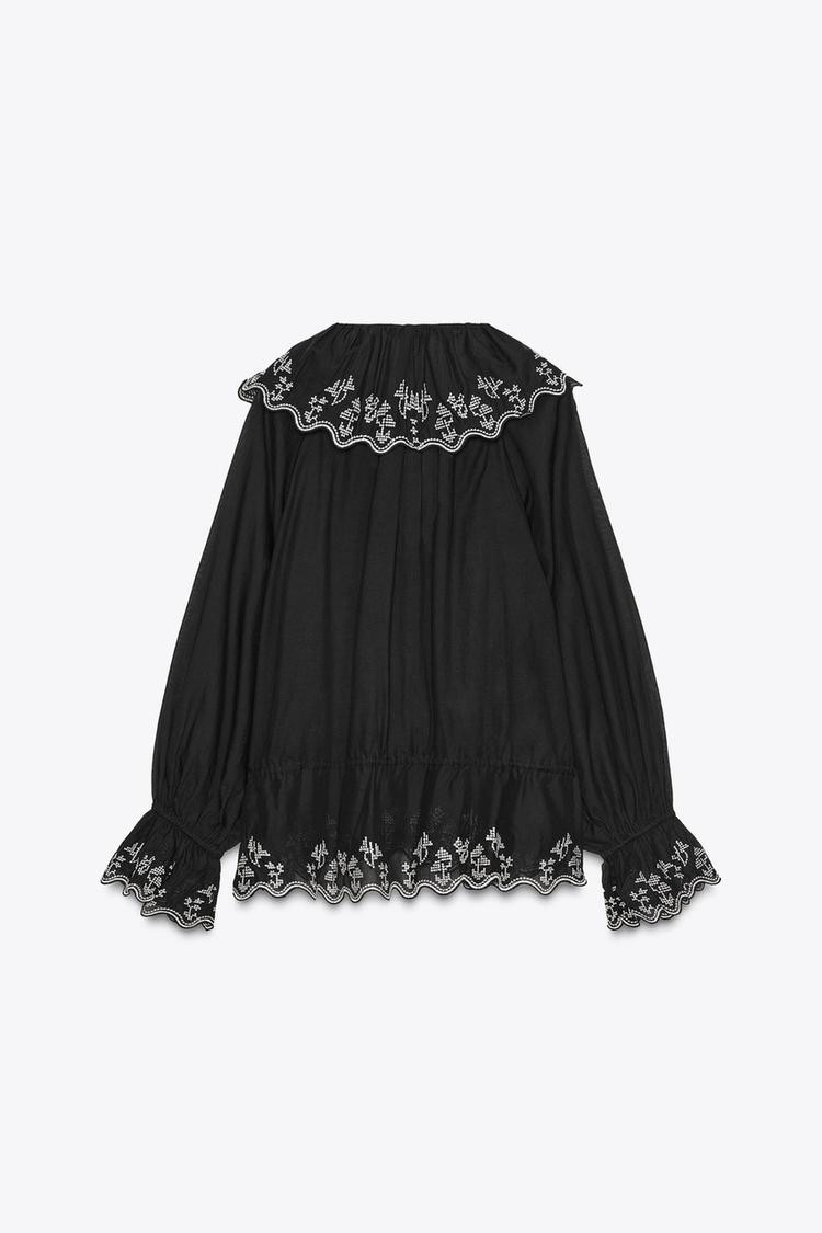 Blouse made from a viscose and cotton blend. V-neck and long sleeves with elasticated cuffs and a ruffle trim. Features contrasting embroidered detail. Ruffled hem.