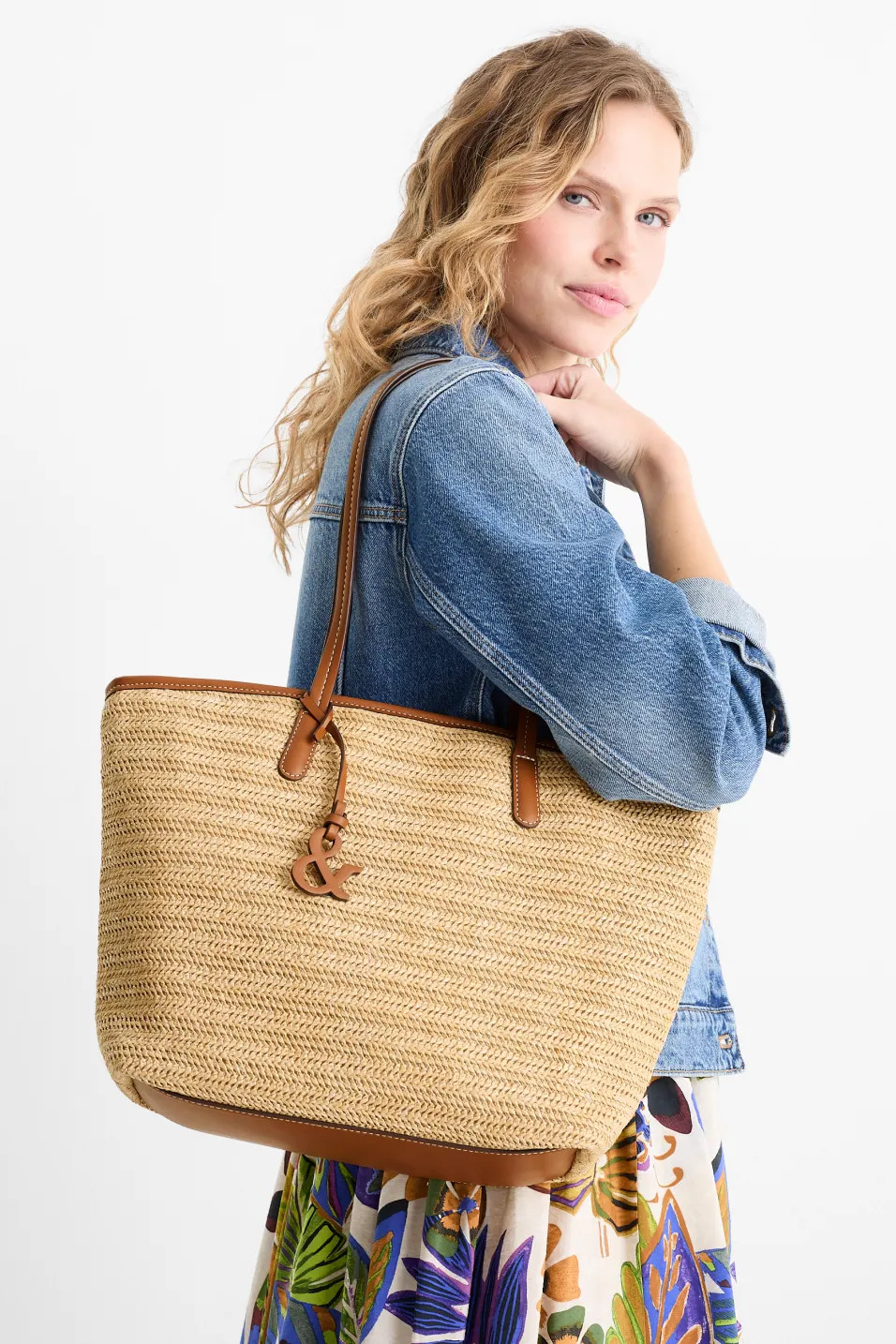 Large straw shopper with faux leather details and a detachable pendant. Zippered main compartment. Smooth interior lining with a zippered pocket.