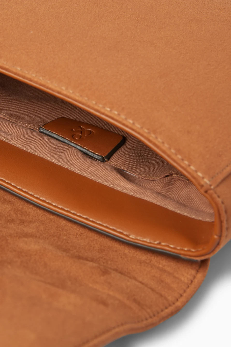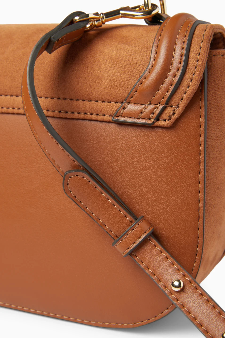 Shoulder bag made of smooth and imitation suede. Main compartment with flap, lightweight woven lining, and a small slip pocket. Adjustable, removable strap with snap hook.